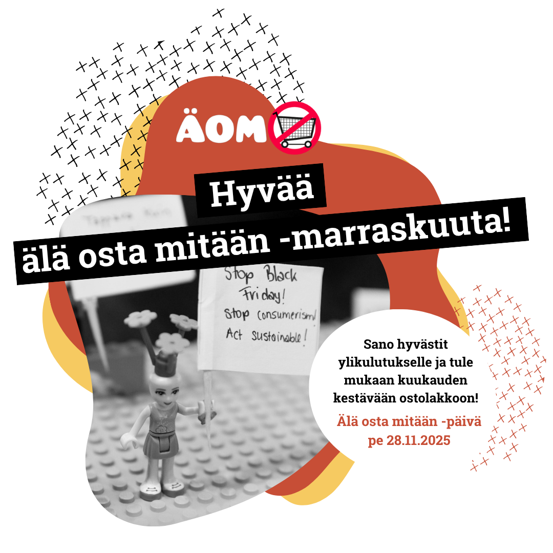 Luontoliiton Älä osta mitään -kampanja huipentuu perjantaina 28.11., jolloin järjestetään useita tapahtumia eri paikkakunnilla. Kampanjan päätapahtuma on Helsingin keskustakirjasto Oodissa.