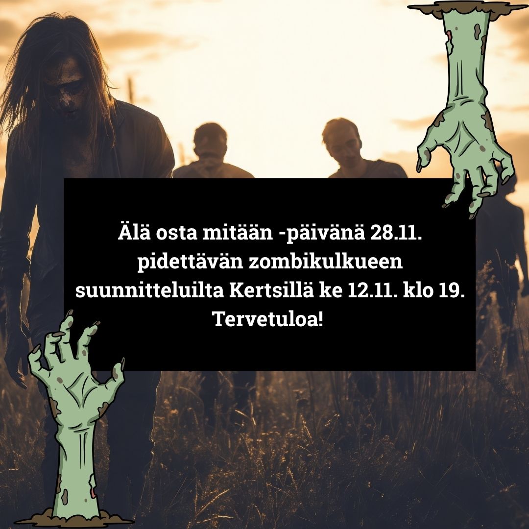 Tervetuloa Älä osta mitään -päivän zombikulkueen suunnitteluiltaan keskiviikkona 12.11. klo 19-20.30 Lupin kerhohuoneelle Pasilaan osoitteeseen Leankatu 4 A