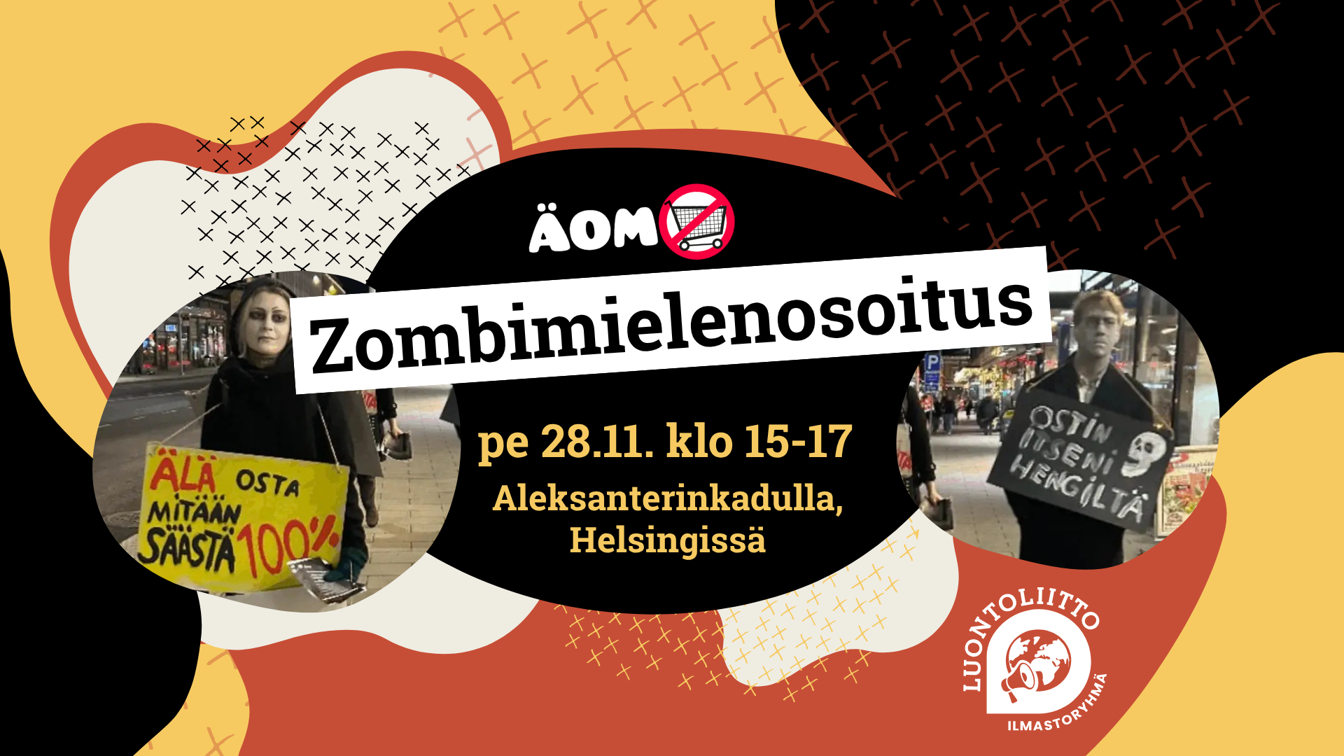 Helsingin ilmastoryhmä järjestää Zombikulkueen Helsingissä Aleksanterinkadulla Älä osta mitään -päivänä 28.11. Tervetuloa mukaan!