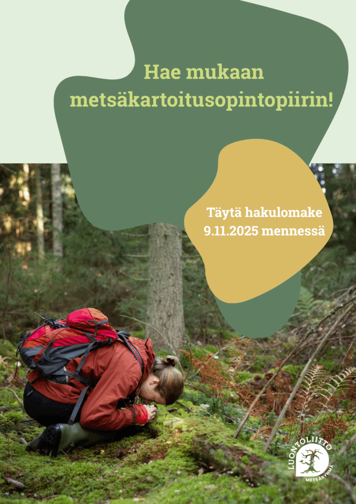 Hae mukaan Luontoliiton metsäryhmän metsäkartoitusopintopiiriin kaudelle 2025-26! Hae mukaan hakulomakkeella viimeistään 9.11.2025 täällä: Metsäkartoitusopintopiiriin 2025-2026 hakeminen – Täytä lomake