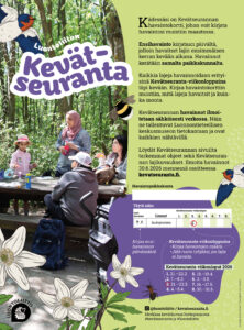Tulosta lasten kevätkortti yhdessä täytettäväksi. Kevätkortilla on 12 helppoa ja tuttua Kevätseuranta-lajia, kuvat ja ohjeet niiden havainnointiin ja tunnistamiseen. Kevätkortti on tarkoitettu alakouluikäisten ja sitä nuorempien kanssa täytettäväksi. Se on tarjolla suomeksi, ruotsiksi ja englanniksi. Lähettämällä täytetyn kevätkortin Luontoliittoon kevään päätteeksi osallistut myös pienten palkintojen arvontaan.