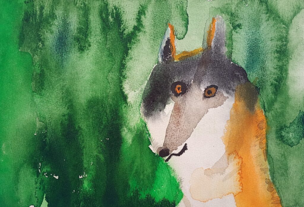 Camilla: Aarni on tehnyt suden, joka muistuttaa väriltään myös hieman kettua. Hahmo on kerta kaikkiaan hurmaava ja luonteikas muotokuva villistä toveristamme. Akvarellien käyttö on taitavaa ja lopputulos raikas ja hauska.”