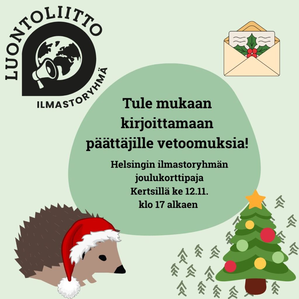 Tervetuloa Helsingin Ilmastoryhmän joulukorttipajaan keskiviikkona 12.11. klo 17 Lupin kerhohuoneelle Pasilaan osoitteeseen Leankatu 4 A. Pajassa kirjoitetaan päättäjille joulukortteja, joissa vaaditaan kunnianhimoisempaa ilmastopolitiikkaa sekä muistutetaan luontokohteiden tärkeydestä. Tervetulleita ovat Luontoliiton vanhat ja uudet aktiivit sekä kaikki toiminnasta kiinnostuneet. Tarjolla on glögiä ja piparkakkuja sekä soittolistalla parhaita joululauluja. Luontoliitto tarjoaa joulukortit ja kirjoitusvälineet. Lämpimästi tervetuloa mukaan!