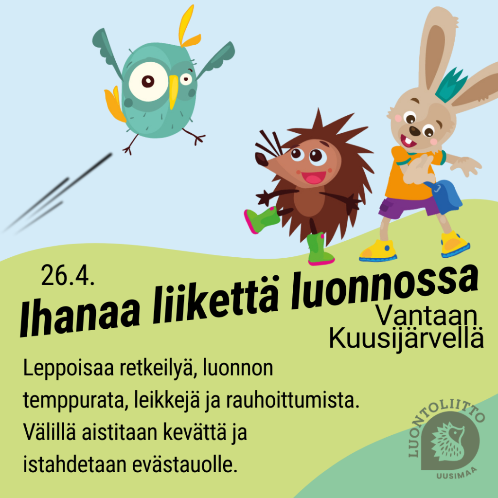 Lähde kanssamme liikkumaan ja aistimaan kevättä Vantaalle, Kuusijärven maisemiin. Pääset aloittamaan päivän ihanalla liikkeellä, sillä luvassa on mm. rauhallista retkeilyä, luonnon temppurata ja monenlaisia luontoleikkejä sekä rentoutumishetki. Välillä pysähdytään aistimaan ja havainnoimaan kevättä ja istahdetaan viettämään evästaukoa.