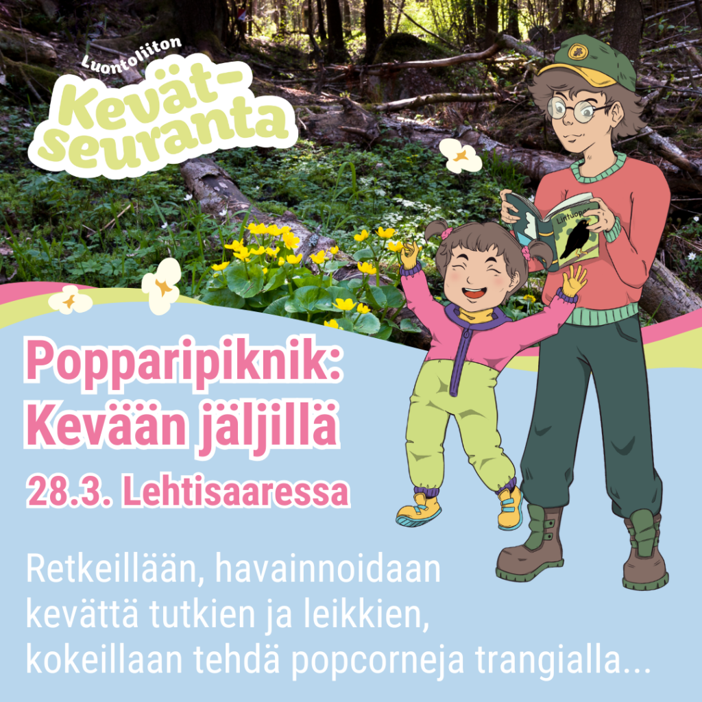 Koko perheen kevätretkellä Lehtisaaressa havainnoidaan yhdessä kevään etenemistä retkeillen, leikkien ja pieniä tutkimuksia tehden. Kasvi- ja eläinhjavainnot ilmoitetaan luonnontieteelliseen keskusmuseoon. Niiden avulla pystytään vertailemaan kevään alkamista ja edistymistä eri vuosina. Retkellä siis autamme ihan oikeita tutkijoita heidän työssään!