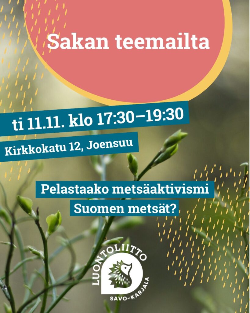 Savo-Karjalan Luontoliitto järjestää tiistaina 11.11. klo 17:30-19:30 teemaillan Joensuun keskustassa Muutoksen Silta -tilojen olohuoneessa. Osoite on Kirkkokatu 12.