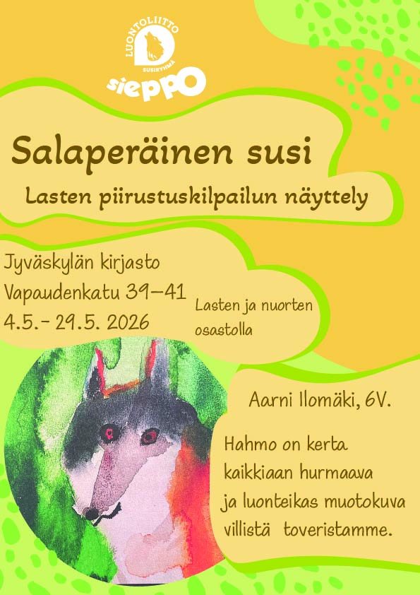 Lasten Salaperäinen susi -piirustuskilpailun voittajatyöt sekä valikoima kilpailuun osallistuneita töitä on esillä Jyväskylän kaupunginkirjaston lasten- ja nuortenosastolla 4.-29.5.2026. Näyttely on avoinna kirjaston aukioloaikoina. Kaikki suden- ja taiteenystävät ovat lämpimästi tervetulleita ihastelemaan teoksia!